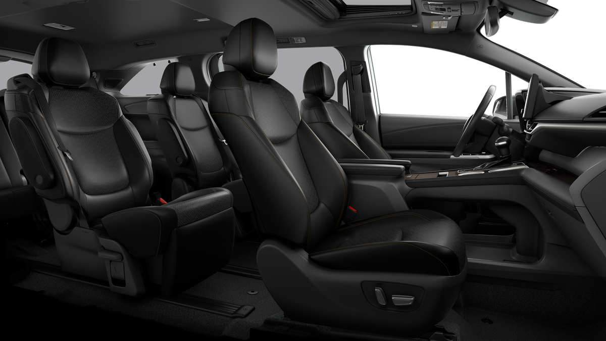 - 7-passenger seating with premium leather-trimmed second-row-seat captain's chairs with super-long-slide feature and ottomans