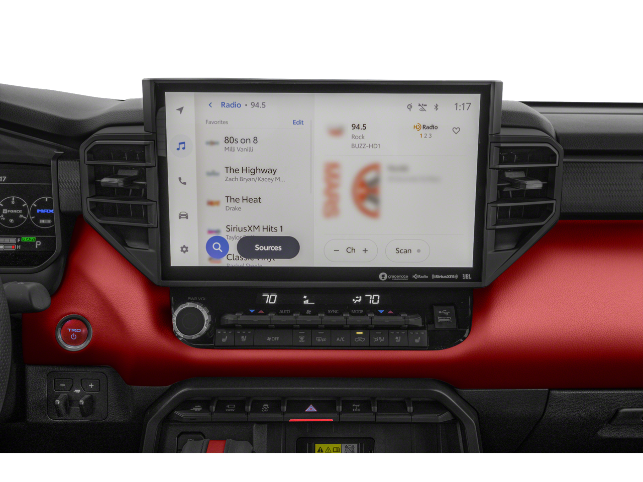 - Radio: Premium Audio w/JBL -inc: 14-inch touchscreen, 12 JBL speakers (including subwoofer and amplifier), Android Auto and Apple CarPlay compatible and SiriusXM w/3-month platinum plan trial subscription, See toyota.com/audio-multimedia for details, Connected services - Safety Connect w/up to 10-year trial, Remote Connect w/1-year trial, Drive Connect w/1-year trial, Service Connect w/up to 10-year trial, Wi-Fi Connect w/up to 3 GB within 1-month trial, See toyota.com/connected-services for details
