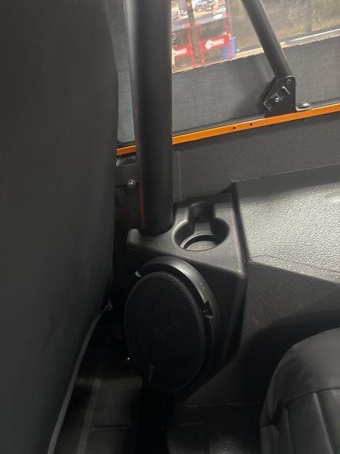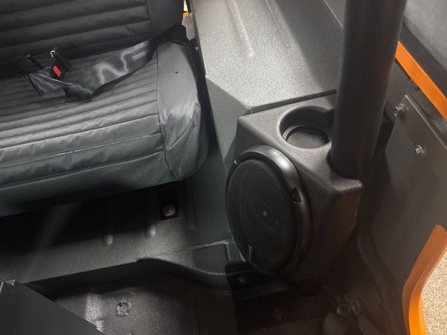 This CJ-7 is sporting a painted front grille, chrome front bumper, SMITTYBILT XRC 9,500 Winch, custom rear bumper with tow hooks and full size Mickey Thompson spare, custom leather wrapped door panels built by Bill Penney accessories, polished aluminum wheels w/ brand new 35 Mickey Thompson tires, and a body lift. New Alpine Bluetooth® Single Din radio, two 6x9 Memphis speakers with rear molded speaker pods, Memphis 5.25 speaker under the dash, plus a custom Ash Gray Rhino lined interior!